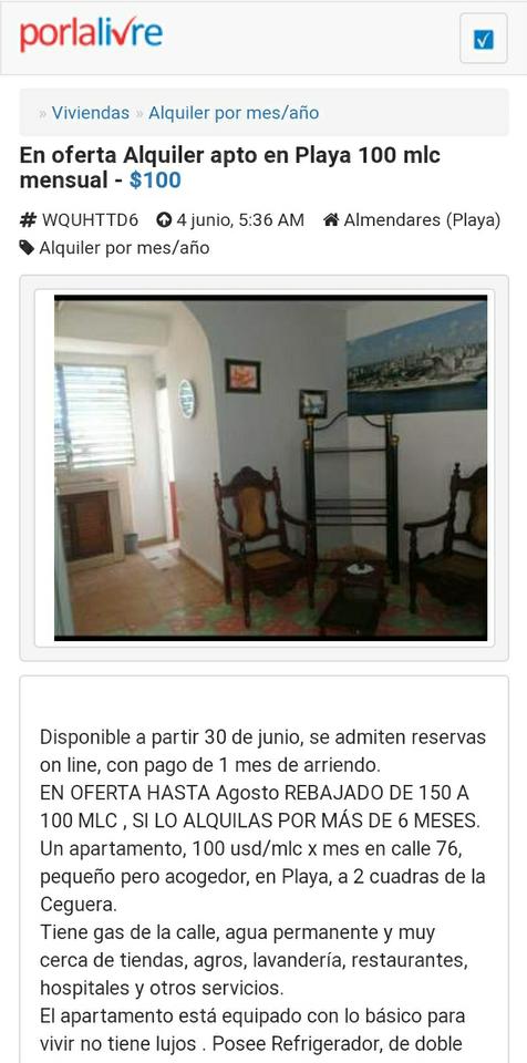 100 mlc mensuales alquiler apt Playa por tiempo indefinido - $100