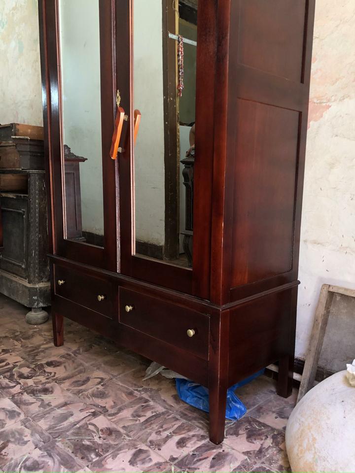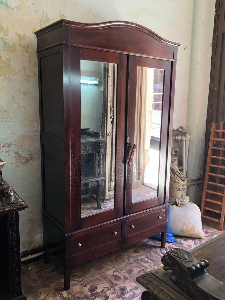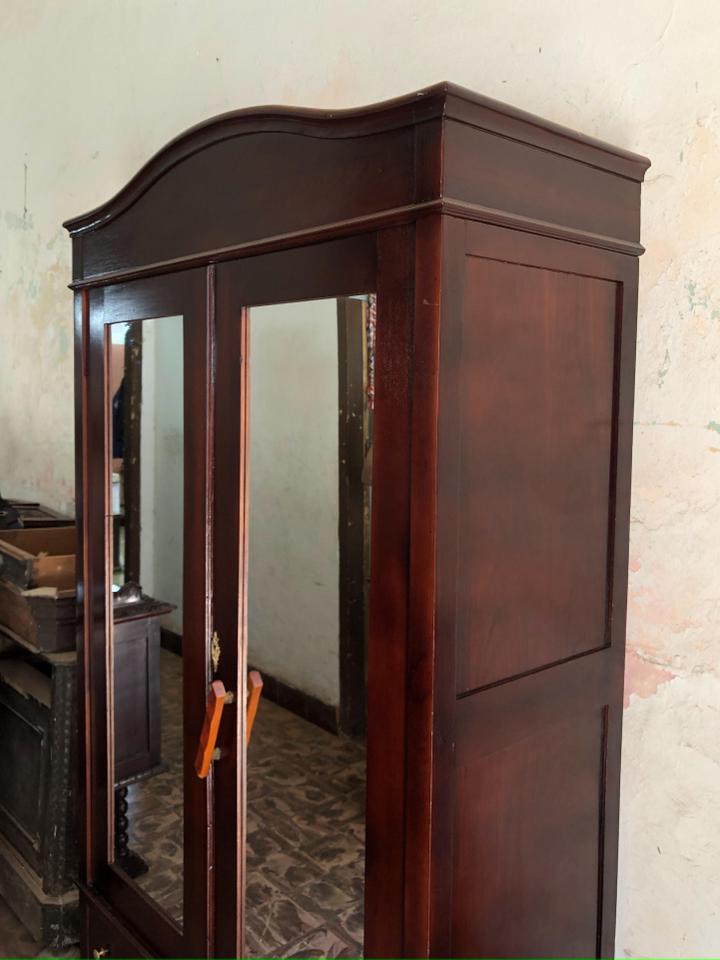 Escaparate antiguo de dos puertas con espejo, acabado de restaurar. En el interior tiene la colgadera para la ropa y un entrepaño.