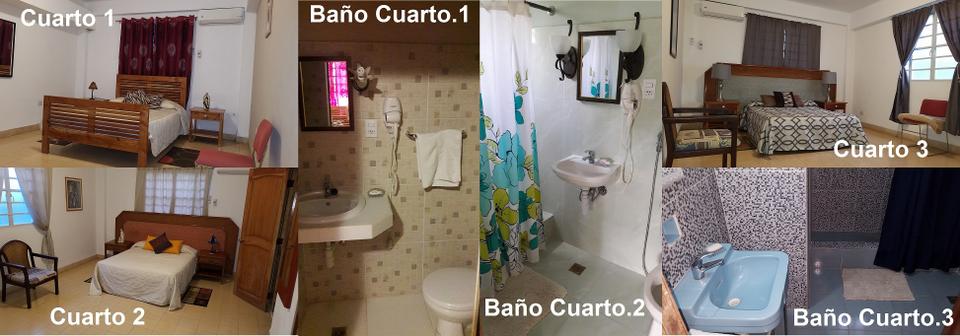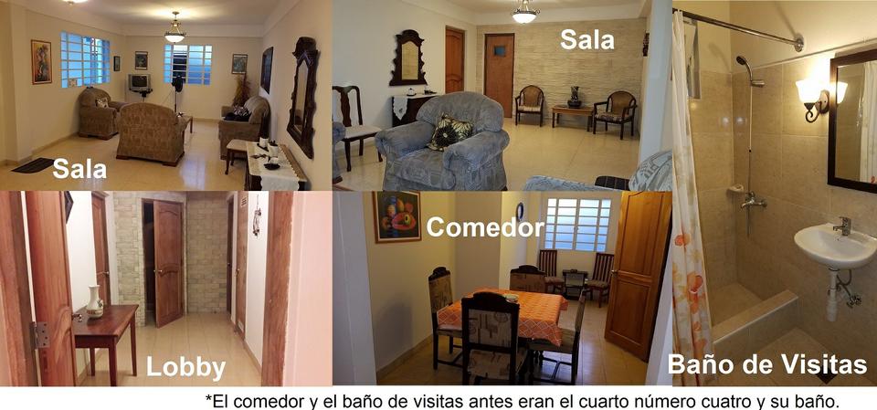 Consta de 3 cuartos cada uno con su baño independiente en perfecto estado todos, Sala bien grande que fue diseñada para que fuera sala comedor, Lobby donde estan las puertas hacia todas la habitaciones, comedor con baño para las vistias, dicho comedor originalmente era otro cuarto más por lo que si se cierra la pared que fue abierta la casa podria tener 4 cuartos con 4 baños,