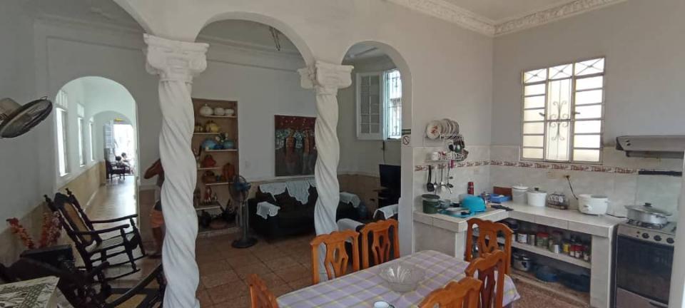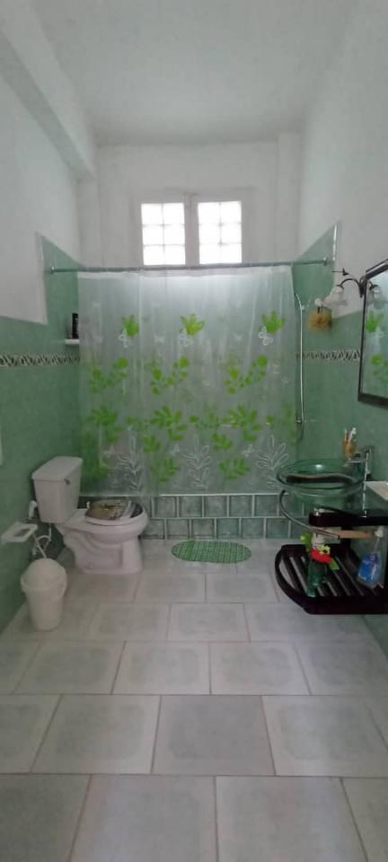 Tiene carposh,portal,sala, 2 cuartos con sus closet con baño intercalado,sala,comedor,cocina.otro baño en p.serv con cisterna propia y meseta auxiliar ( para hacer preparados de comida) bancos de aluminio para actidades recreativa.y su placa libre.
