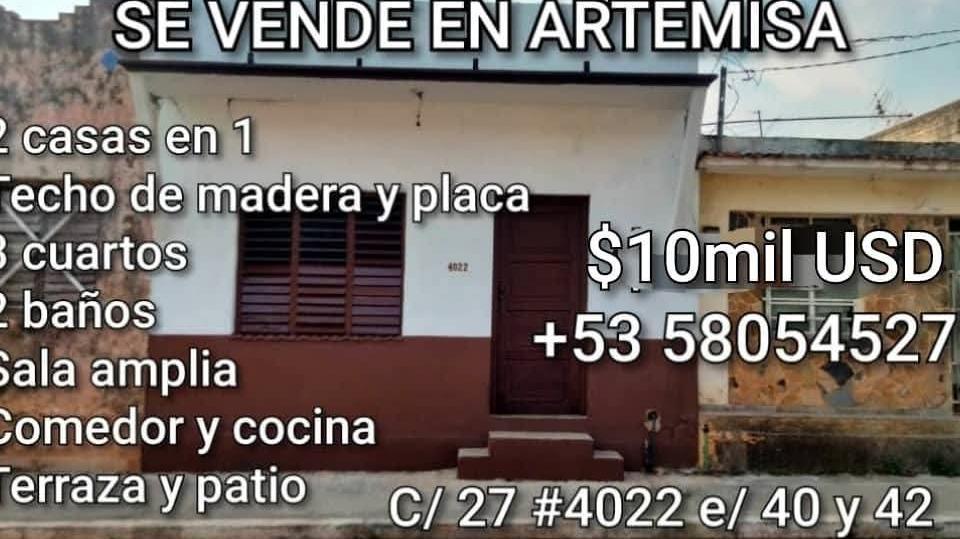 SOLO VENTA. Casa grande casi dos en una, de 3 cuartos amplios, 2 baños, sala grande, pasillo interior ancho, comedor, cocina, terraza y patio con espacio para ampliarle. Sin pasillos laterales. Muy importante agua 24 horas, barrio super tranquilo y papeles en regla. Techo de madera y placa en buenas condiciones solo está falta de pintura o falso techo. Ubicada en el centro del pueblo de Artemisa a 3 cuadras del parque y Boulevard en el mismo Céspedes. PRECIO FINAL $10mil USD. Contacto de la dueña 58054527