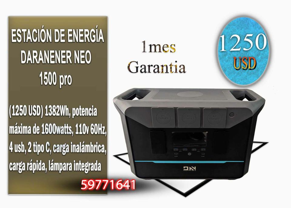 (1200 USD) Capacidad de la batería 1382 Wh, 3.2 v, 27 Ah, potencia máxima de salida 1600W, 110v 60Hz, 4 usb 3.0, 2 tipo C, carga rápida y lámpara integrada. Usa 3 modos de carga igual que la anterior, batería de lifepo4, pero es más potente que la anterior y ninguna se vende con el panel solo para cargar a la corriente.