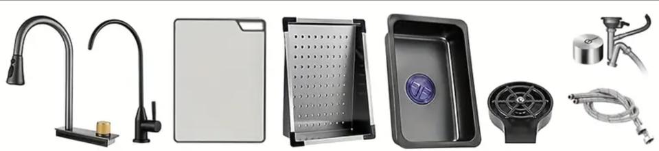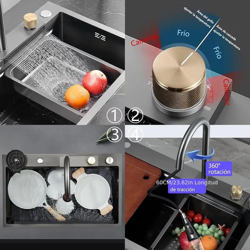 Incluye grifo principal y de grifo de cascada para enjuagar los alimentos, grifo de agua pequeño, lavavajillas y recogedor de agua, brindando una experiencia completa y práctica para el uso diario en el hogar.