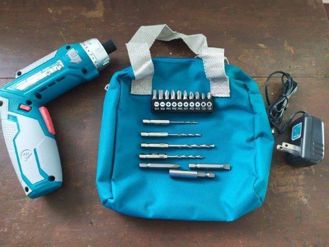 Atornilladora-taladradora portátil, articulada, con batería de Litihum, luz frontal, 8V. Marca Total. Nueva, con cargador para batería y los siguientes accesorios: 10 puntas de destornillador, 2 puntas de destornillador alargada para lugares de difícil acceso, 1 punta para aflojar o apretar tuercas, 4 barrenas de distintos diámetros. Precio 100 cuc (Rebajado a 85 cuc)