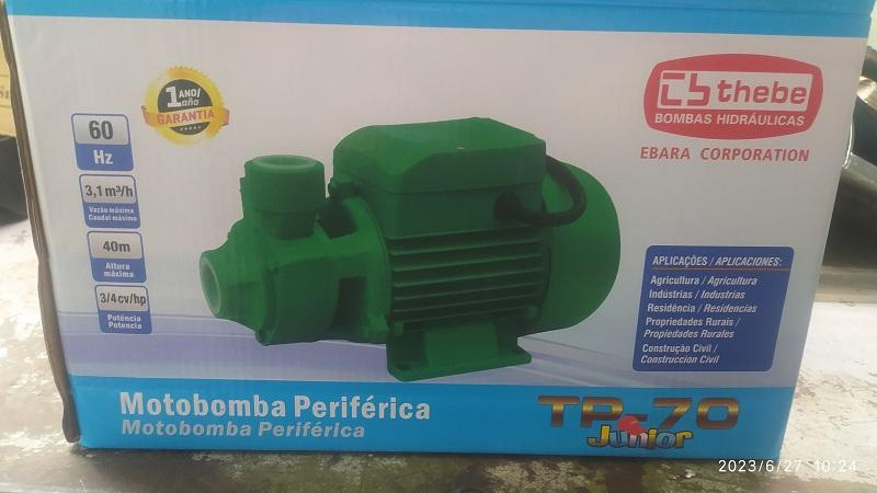 Se vende una bomba de agua nueva en su caja, de 1 caballo de fuerza, sube una altura de hasta 40 metros y una potencia de 0.55 Kw, 1 HP. alimentación de voltaje 110v 60 Hz, distancia de succión o profundidad de la cisterna hasta 8 metros, motor de 3450 rpm. Capacidad de bombeo de 3.1 metros cúbicos por hora. Diámetro de entrada y salida de 1 pulgada. Color verde. Marca THEBE. Bomba periférica.