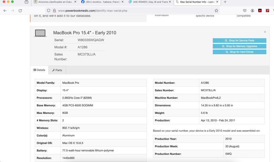 Hola, vendo mi macbook pro 15 pulgadas del 2010, modelo A1286, tiene un procesador i7 a 2.66 GHz (620M), display glossy o brillo con resolución de 1440x900, 8Gb de RAM DDR3, demas detalles en fotos. La tengo en mi casa en el Cerro. Habana. Interesados por wtsapp: +436704039820