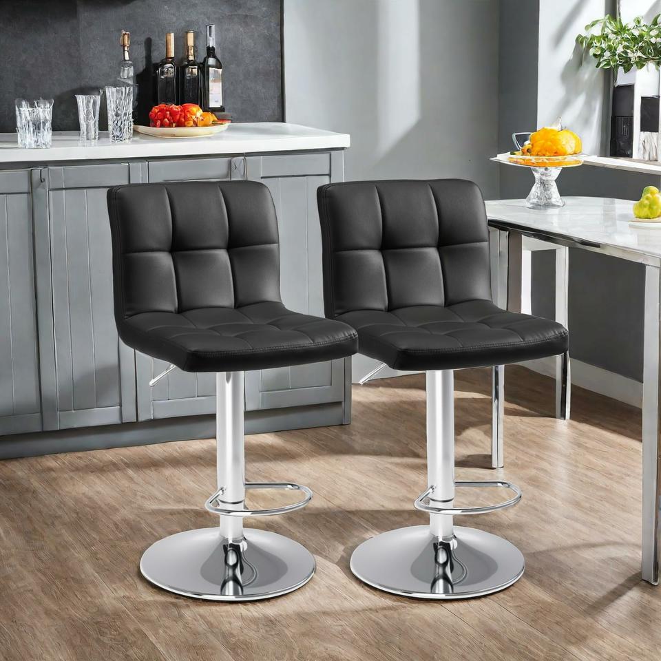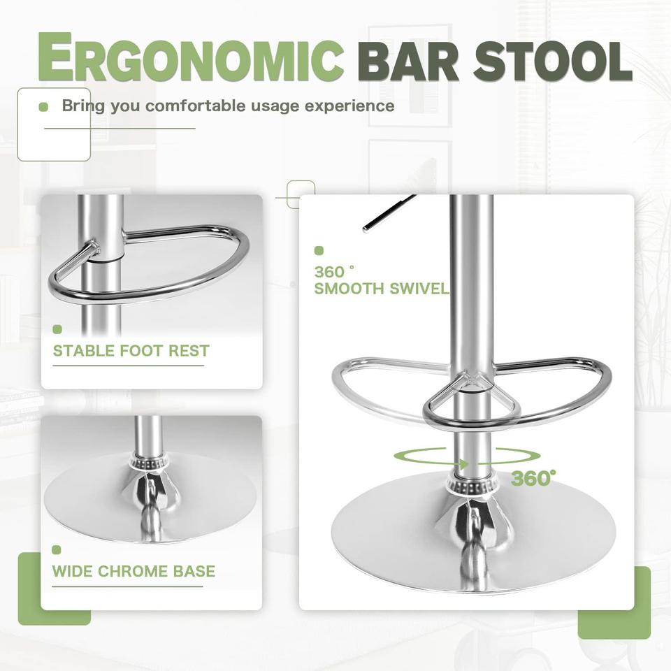 - Giro suave de 360 ° con asiento de piel regenerada, construido con base de cromo pulido y reposapiés.