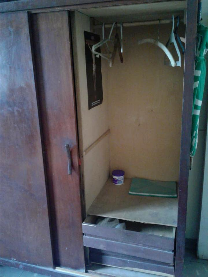 Tiene dos puertas de corredera y en su interior dos gavetas y donde colgar la ropa