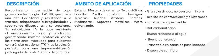 Recubrimiento impermeable de capa gruesa con tecnología ELASTIK, que ofrece una alta flexibilidad y resistencia a la tracción, adaptándose a irregularidades y soportando dilataciones y contracciones. Su reticulación UV lo hace resistente al ensuciamiento, agua y alcalinidad, garantizando máxima protección contra las filtraciones. Adecuado para cubiertas con trânsito ocasional (TK1), es la solución perfecta para una impermeabilización prolongada de hasta 10 años de garantía.Ámbito de aplicación