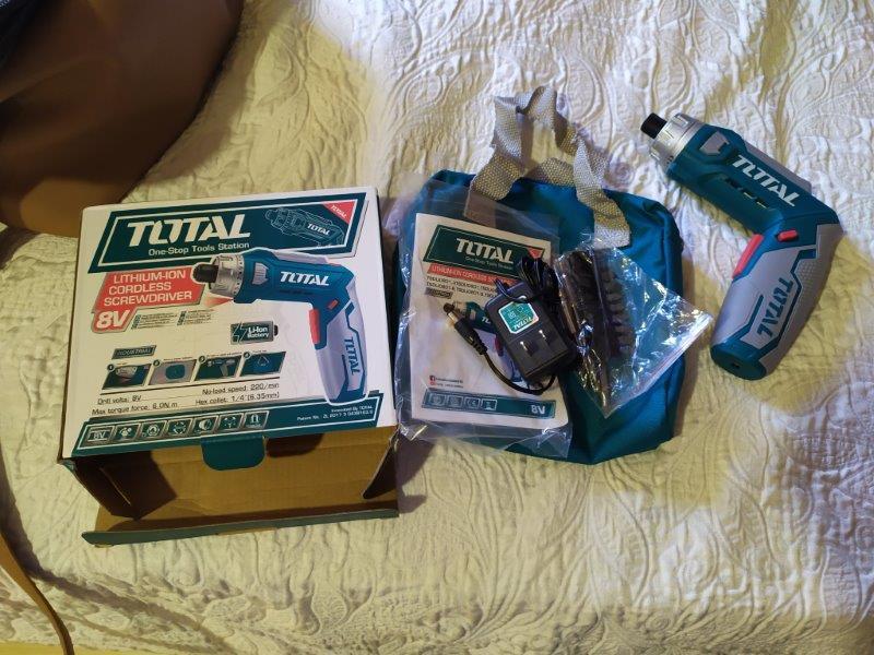 Atornilladora-taladradora portátil, articulada, con batería de Litihum, 8V. Marca Total. Nueva, con sus accesorios y cargador para batería. Luz frontal.
