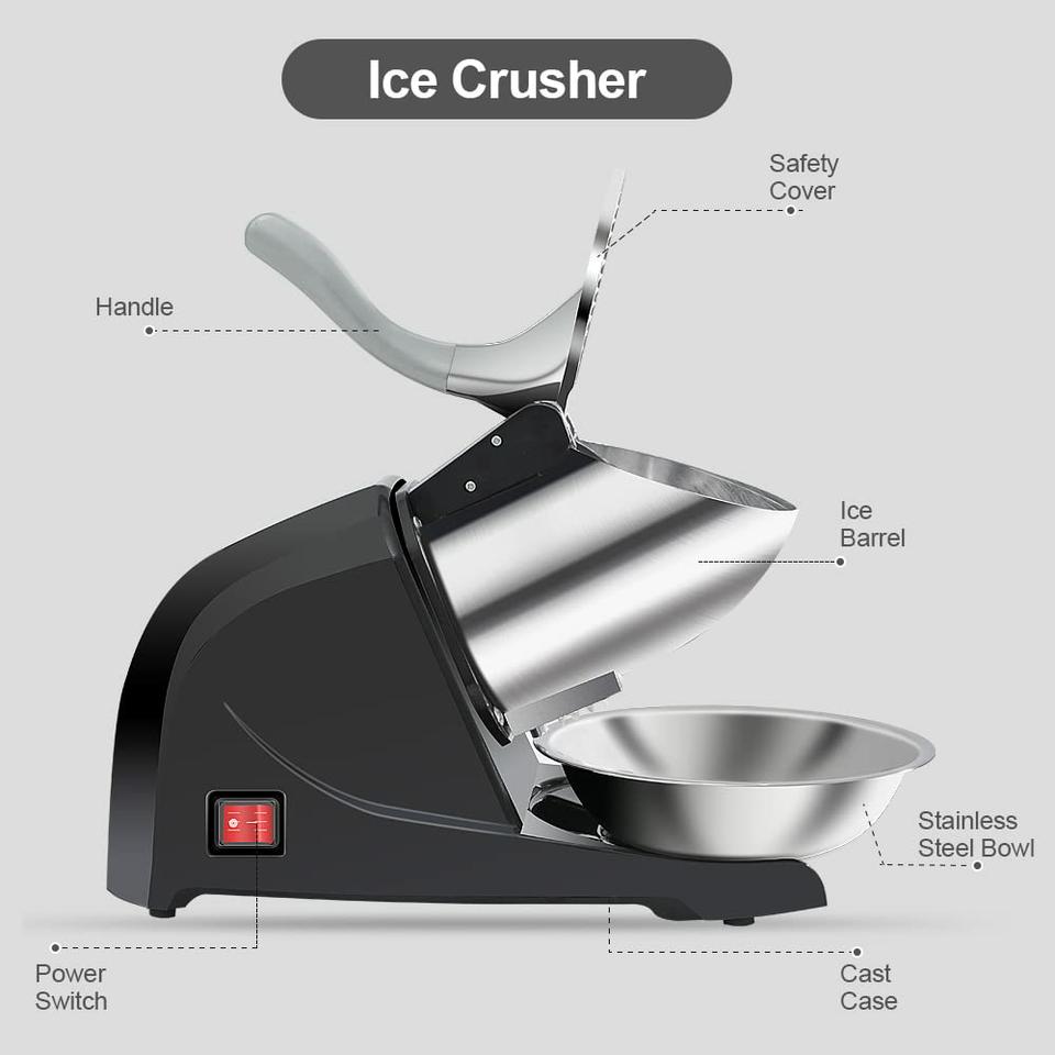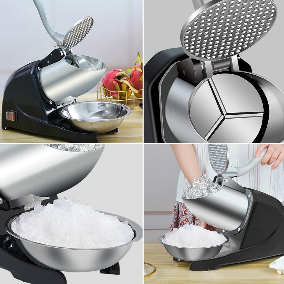 - Triturado de hielo de alta eficiencia: Con tres cuchillas y un potente motor de 380 W, la afeitadora de hielo aplasta hasta 280 libras de hielo por hora, perfecta para reuniones familiares y fiestas.