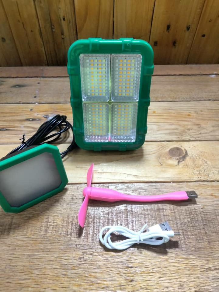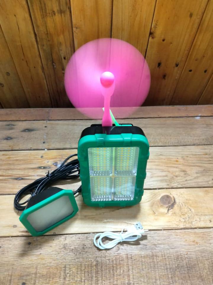 Lampara recargable con panel solar . Incluye otro foco pequeño para mayor iluminacion. Mas ventilador con puerto USB y cable cargador. Bateria 1800 mhA