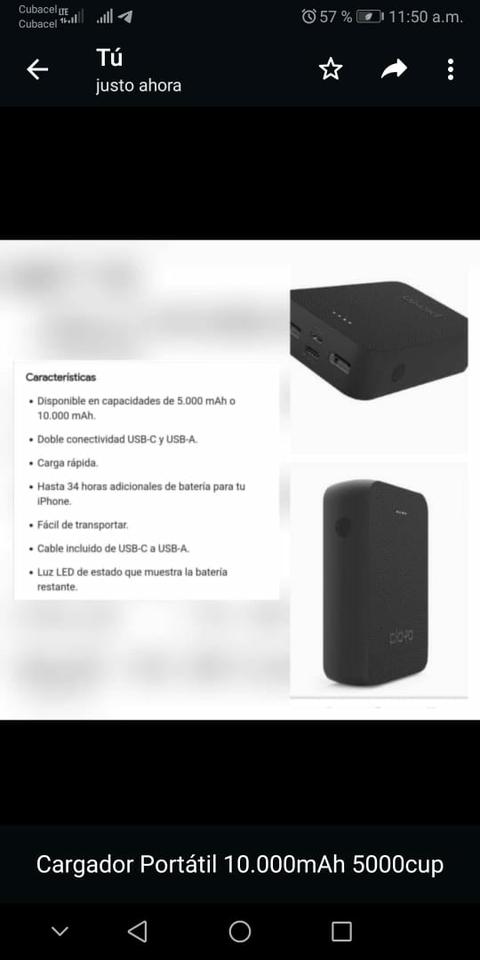 Cargador portátil 10000mAh, carga rápida, nuevo en su caja, varios puertos, 5000cuo, 55004836(588290)