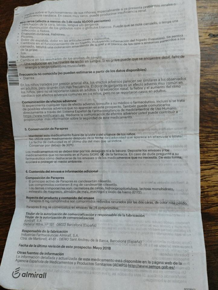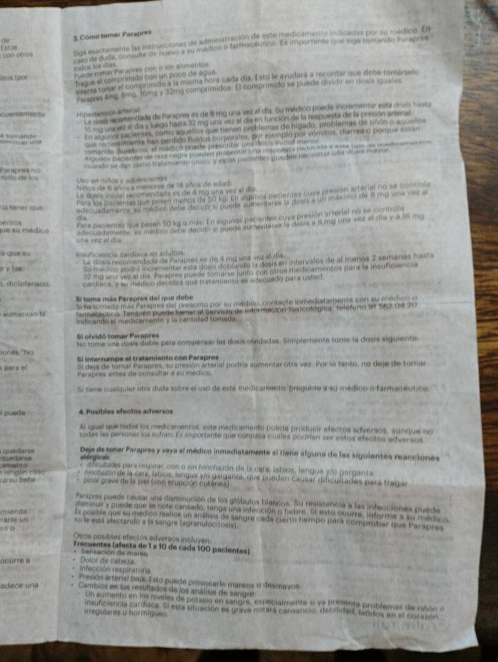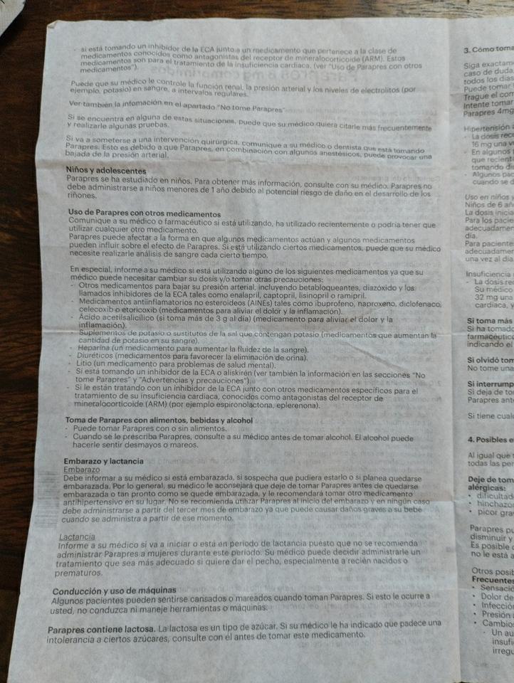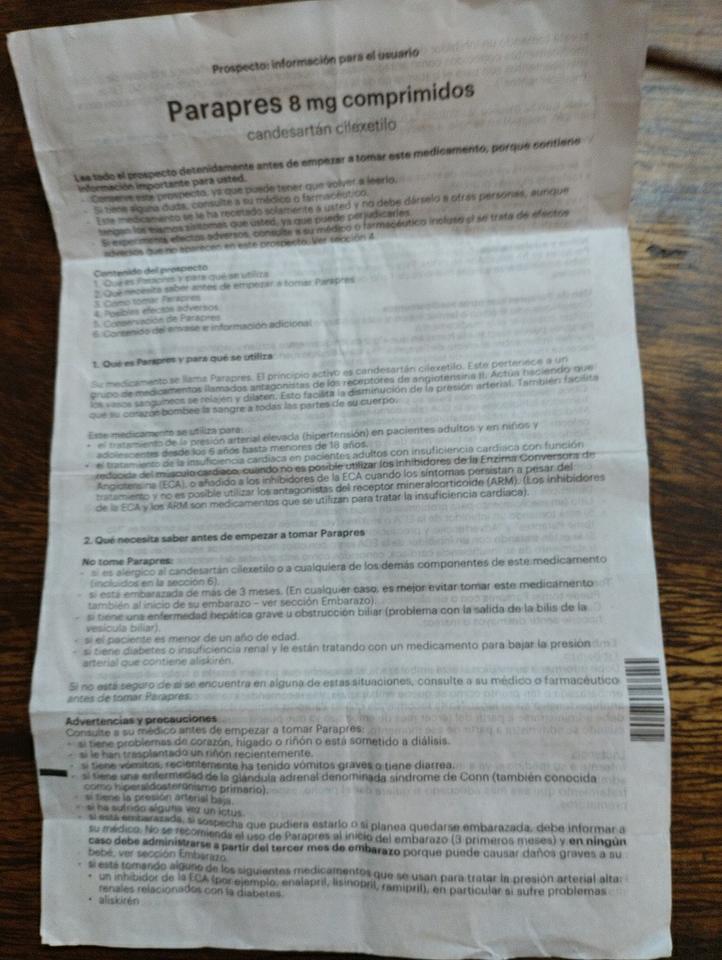 Se vende Parapres de 8 mg para hipertensos, el blister de 14 tabletas a 500 cup. Se adjunta prospecto.